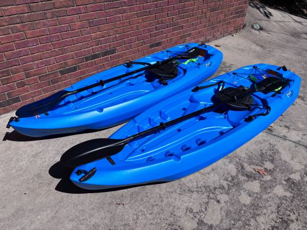 Both kayaks have been lightly used and always stored indoors, away from the sun. No cracks, leaks, or repairs needed — ready to paddle right now.