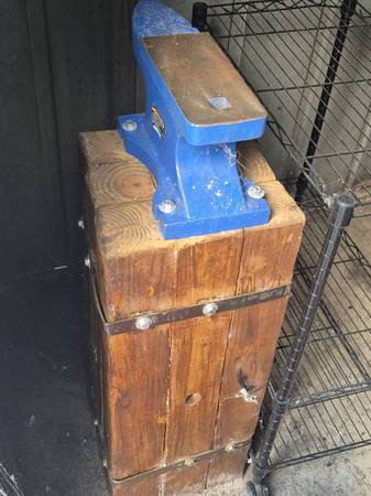 I built the Anvil stand by hand and wrapped it with a steel band and fastened it with Lag bolts. The anvil is a cast anvil and has never been used. Will need sanded and corners rounded before use. Also a Mr. Volcano 2 (2 burner forge). I have put the refractory on the forge but have never put together the propane burners. Also comes with an extra 4.5lb of refractory to patch any cracks. Two fire bricks, Tongs, 5 minute epoxy, 5 1095 steel blanks (12" in length) 42 sand paper pcs with varying grit from 120-3000, small pin stock, 3lb blacksmithing hammer and punch tool .