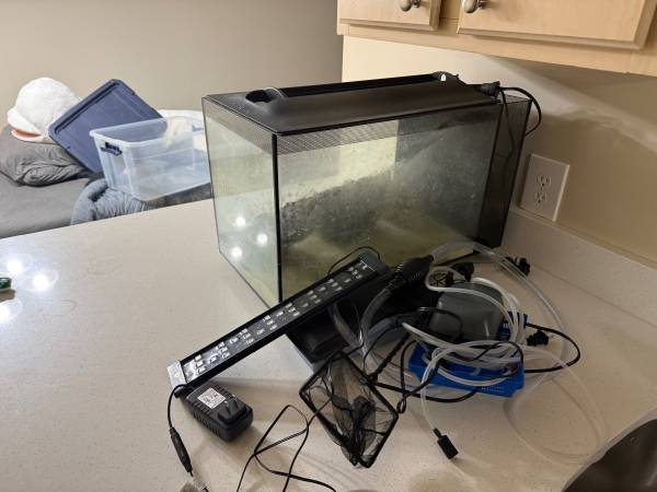 I have a 13.5 gallon Fluval sea tank complete with filtration and light. All parts work and it was running and set up for about a year. Moving and don’t have space for it at our new home. Comes with a bag of live sand (Carib Sea), coralife marine salt, tank heater, thermometer, siphon pump, and refractometer to test salinity, and 3 coral rocks. Must be able to come pick up. Please be aware it is dirty in the pictures but is in like new condition!!
