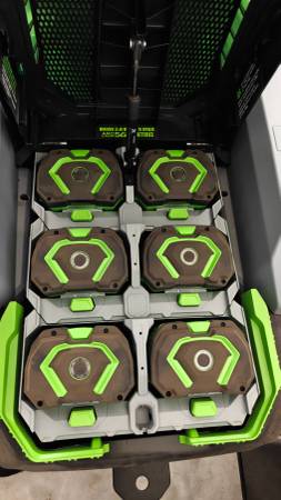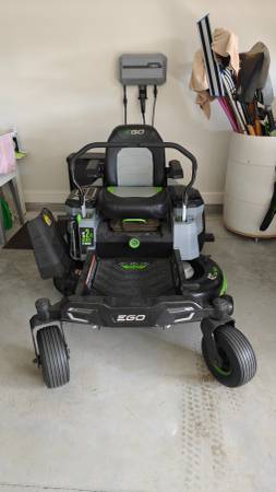 EGO 42" Zero Turn Mower with (6) EGO 10 amp batteries and wall charger with 79 hours. Well maintained and in excellent running condition. Comes with remaining warranty an extra set of blades. Also includes mulching plug. The batteries alone are worth more than $3000.