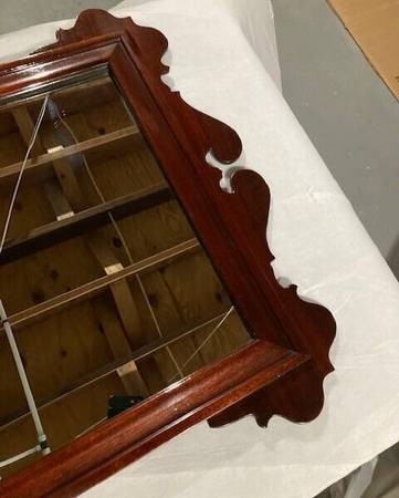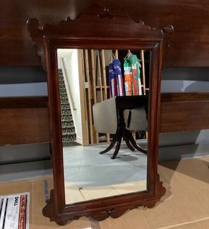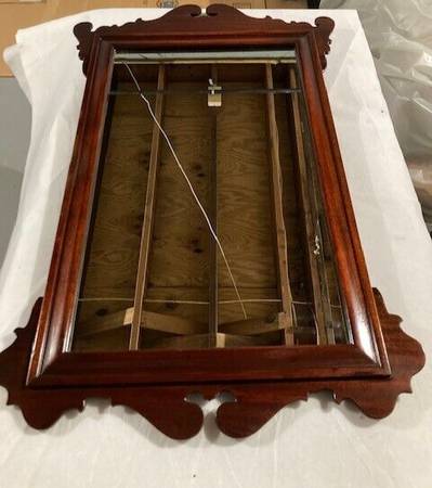 Original family ownership offering - vintage, high quality, handmade, mahogany Georgian / Chippendale style, beautiful grain, hanging wall mirror. CONDITION: VERY GOOD. There are no scratches, fading, discolorations, cracks, chipping or stains on the rich mahogany surface. Its construction remains tight and sturdy in its original, unaltered condition. The wood backing is in very good condition with no fractures, cracking or splitting. The mirror glass remains very bright and clean with no fogging or desilvering. Purchased in the mid-1930’s by owner’s parents.