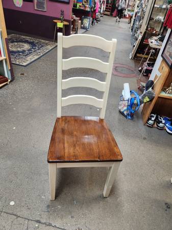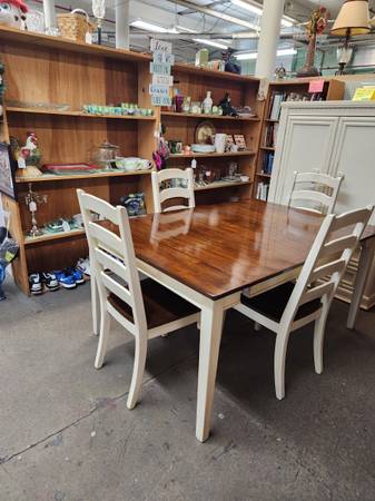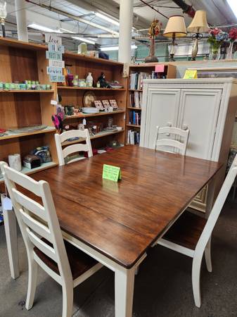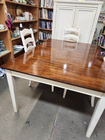 Ashley Signature heavy solid wood table with 4 matching chairs. White frames with brown wooden tops. To purchase go to Joey's Thrift Mall located at 1100 Tenth Ave. Go to booth 305-VBT.