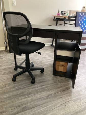 Desk and chair combo with light wear on top of desk. Chair brand new and barely used. Spacious cabinets with adjustable shelving. Cable control center under desk
