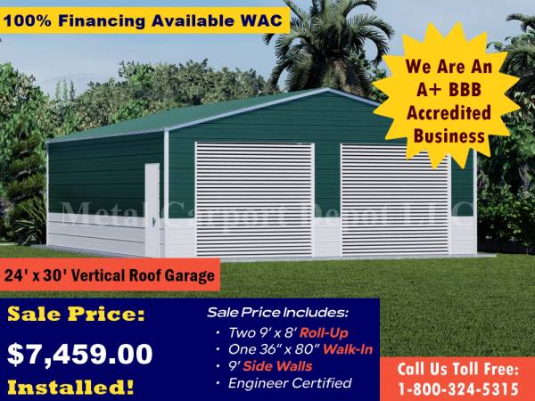 Safeguard And Protect Your Valuable Vehicles And Equipment From The Elements For Years To Come And Save A Huge Amount Of Money With This 24' x 30' Platinum Style Metal Building, 31' Long Roof - 30' Long Frame/Building, with the 29 Gauge Vertical Metal Roof. It is on sale now for just $7,459.00 After Discount, Including Free Delivery and Installation on your Existing Concrete Slab or Level Ground. These Special Prices Will End Soon. So Call Now To Save Big!