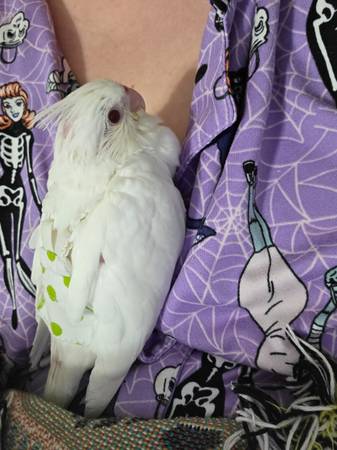 Just weaned, and is very sweet. Never been clipped and he loves to sit with you. Im pretty sure hes a male because hes already trying to whistle tunes. Hatch date is 9-14-25. Just the cockatiel, no...