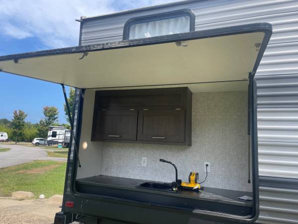 The fireplace makes for a lovely evening in the living room area along with Bluetooth sound system and outdoor lighting. The awning is still in decent condition with electric open and closing. The outdoor kitchen is handy and features a sink, cabinetry and counter space. The trailer has been amazing for our family of six and we absolutely adore it - only selling it as we are looking to downsize for awhile. This is the ULTIMATE bumper pull trailer for a family set up.